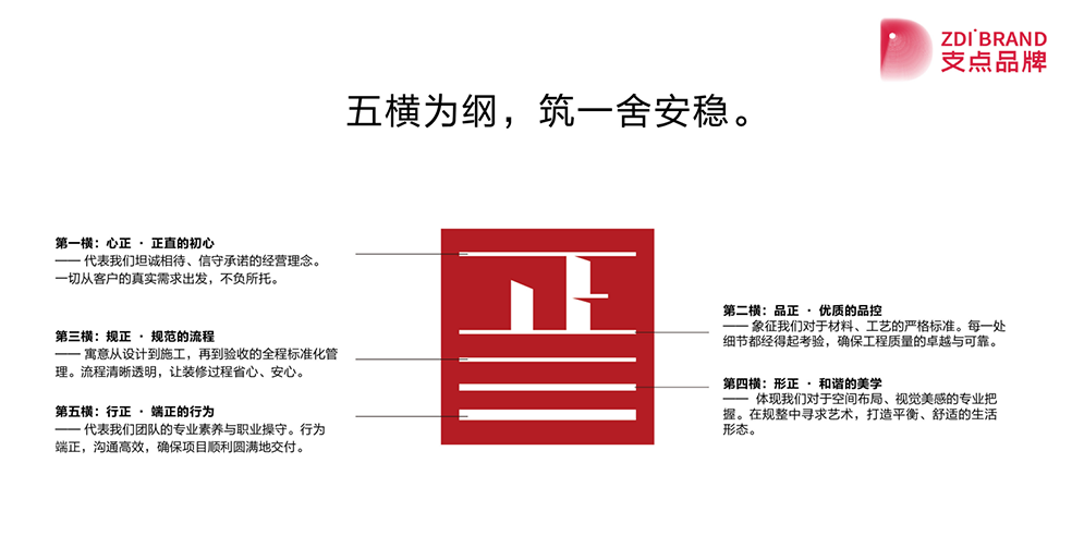 我们深度挖掘“正”的内涵,为其构建了独特的 品牌文化 体系,并凝练为一句有力的 品牌广告语:“正心,筑正舍”。这不仅仅是一句口号,更是一个包含五大维度的价值承诺: